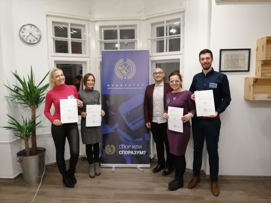 U skladu sa Sporazumom o saradnji koji je naš fakultet potpisao u oktobru 2019. godine sa Institutom za medijaciju, pregovaranje i javne politike iz Novog Sada, naši profesori i saradnici (doc. dr Sanja Škorić, doc. dr Maja Subotin, msr Stefan Ditrih i Jelena Ilić, dipl. pravnik) su prošle nedelje završili opštu obuku za medijatora - posrednika, koja je uslov za licenciranje pri Ministarstvu pravde Republike Srbije.