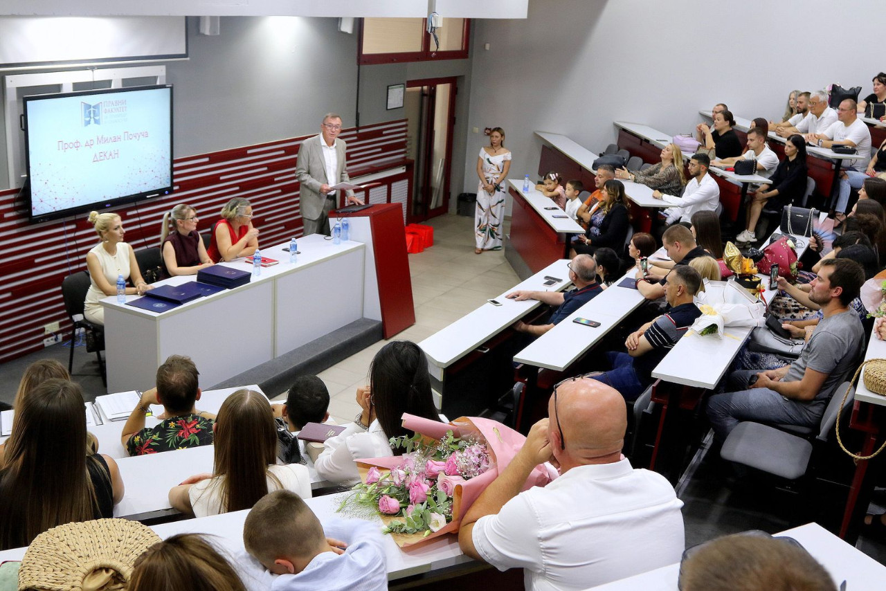 Nakon intoniranja univerzitetske himne „Gaudeamus Igitur“, diplomirane pravnike i njihove roditelje i prijatelje pozdravio je dekan fakulteta prof. dr Milan Počuča koji im je čestitao na uspešno završenim osnovnim akademskim studijama. Naglasio je da je iza njih dug i nimalo lak put koji su oni uspešno prešli, kao i da njihovi roditelji treba da budu ponosni.