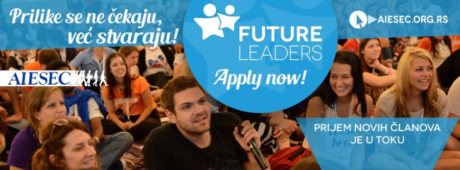 Početak nove godine fakulteta znači i vreme za nove odluke u vezi tvoje budućnosti, s toga studentska organizacija AIESEC u okviru “Future Leaders” programa sprovodi prijem novih članova sa porukom - “Prilike se ne čekaju, već stvaraju”. AIESEC u Srbiji već 60 godina stvara mlade ljude sposobne da pozitivno utiču na okolinu. Kroz aktivno uključivanje studenata u rešavanje društvenih problema kroz organizovanje programa stručnih i volonterskih praksi, kao i različitih projekata i konferencija, studenti imaju prilike da steknu iskustvo, prevaziđu svoje granice i iznenade sebe saznanjem o mogućnosti ličnog razvoja. Internacionalni duh organizacije kao i povezanost sa koorporativnim sektorom omogućava studentima mrežu kontakata, a konkretan rad u timu ih čini spremnijim da se jednog dana lakše snađu u realnom poslovnom okruženju.
