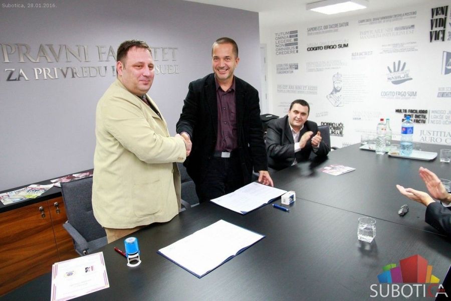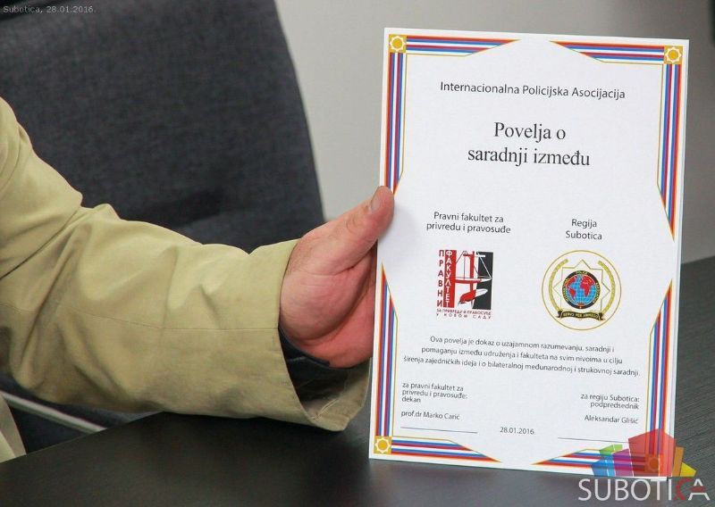 Dekan Pravnog fakulteta za Privredu i pravosuđe, prof. dr Marko Carić, i potpredsednik Internacionalne policijske asocijacije regije Subotica, Aleksandar Glišić, potpisali su protokol o saradnji.
