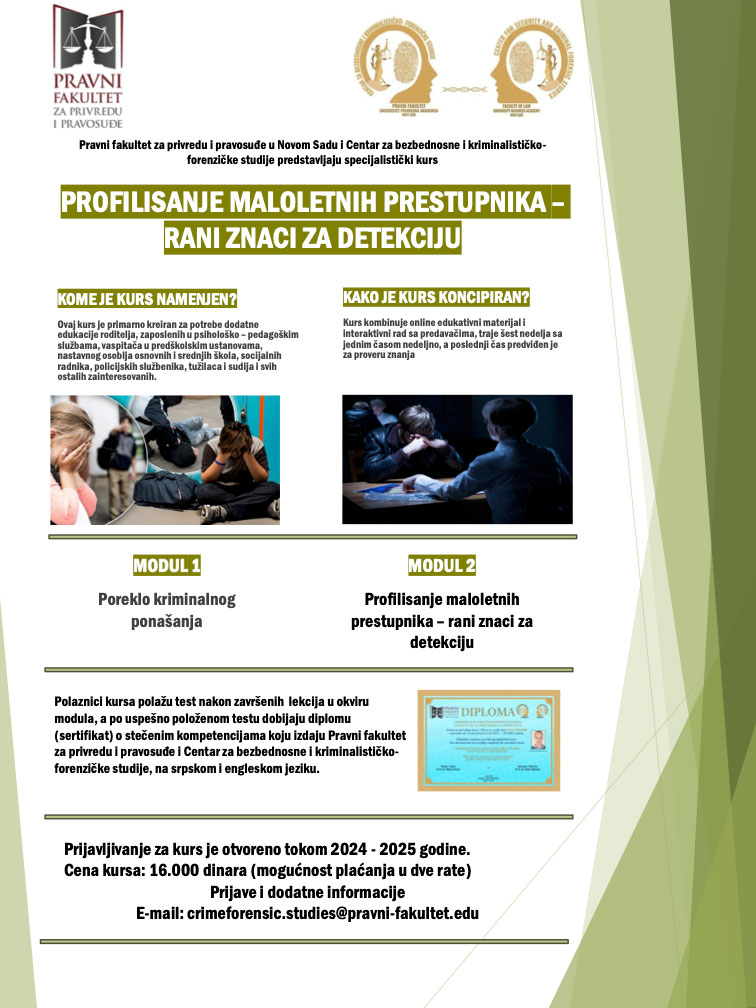 Uvažavajući aktuelne društvene izazove i potrebu delotvornog odgovora za sprečavanje nasilja, posvećeni misiji da obrazovanje ima smisla samo ukoliko ide u korak sa društvenim tokovima, svesni uticaja koji imamo za dugoročni prosperitet mladih, motivisani za edukaciju i transfer znanja, Pravni fakultet za privredu i pravosuđe u Novom Sadu i Centar za bezbednosne i kriminalističko-forenzičke studije predstavljaju specijalistički kurs „Profilisanje maloletnih prestupnika – rani znaci za detekciju“.